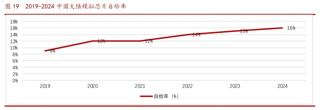 2019年-2024年,我国模拟芯片自给率不断提升。根据智研咨询数据,2019年中国大陆模拟芯片自给率仅为9%,2019-2020年有一波明显上升,突破了12%,2024年来到了16%左右。