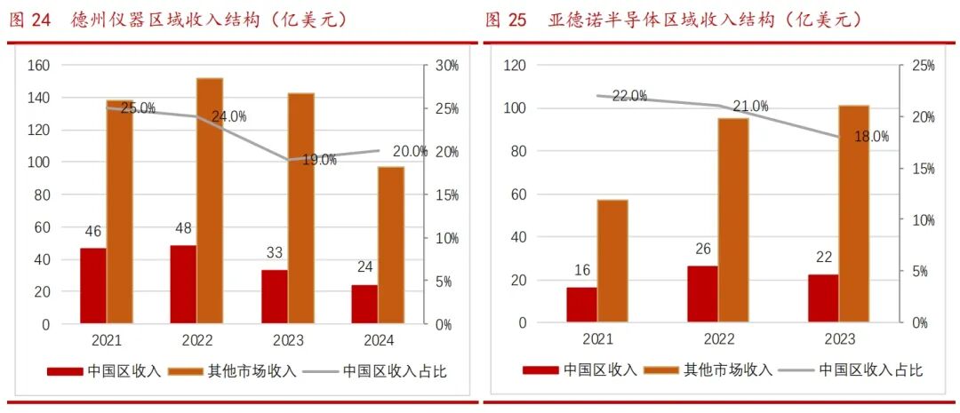 反观全球模拟芯片大厂TI、ADI在中国的营收占比近年来出现下滑。